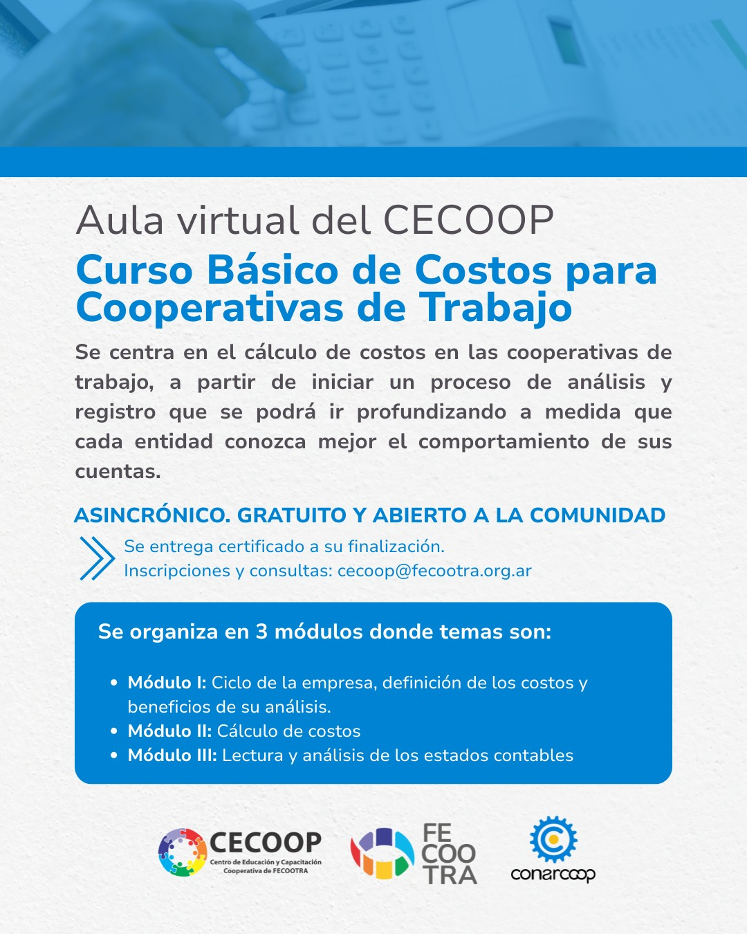 El curso se encuentra disponible en nuestra Aula Virtual del CECOOP, se organiza en tres módulos con los siguientes temas: Ciclo de la empresa, definición de los costos y beneficios de su análisis; Cálculo de costos; Lectura y análisis de los Estados Contables