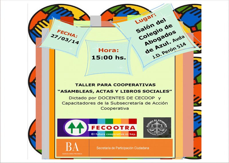 El mismo se llevará a cabo en el Salón del Colegio de Abogados de Azul, ubicado en Juan Domingo Perón Nº 514 a partir de las 15 hs y estará a cargo de capacitadores del CECOOP y la Secretaría de Accion Cooperativa.