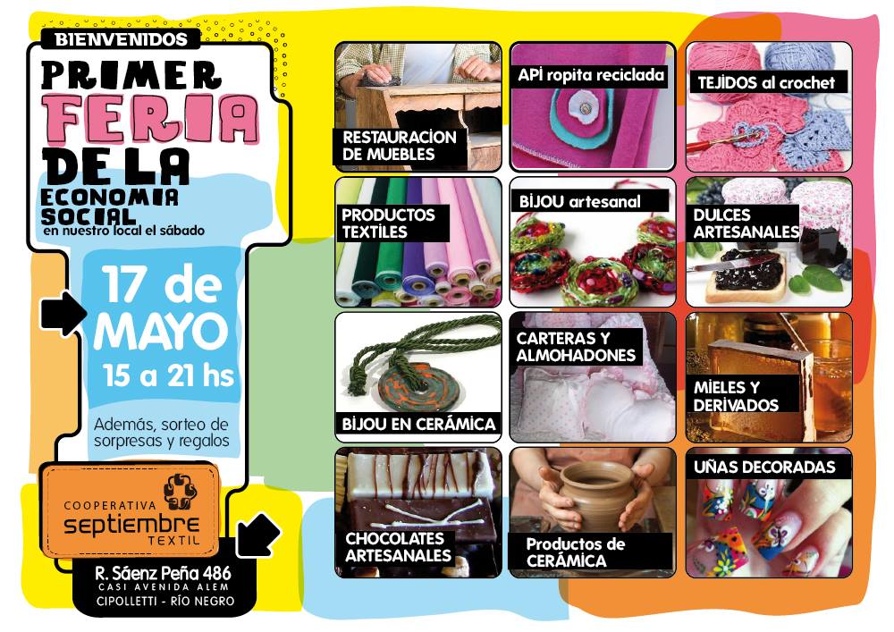 La cooperativa de trabajo Septiembre Textil, de la localidad de Cipolletti, Río Negro, realizará el sábado 17 de mayo la Primer Feria de la Economía Solidaria. La misma se llevará a cabo de 15 a 21 hs en el local de la cooperativa ubicado en la calle Saenz Peña Nº 86 de dicha localidad. Además de la Septiembre textil, participarán del evento emprendedores que ofrecerán tejidos, textiles, bijou, cerámica, carteras, dulces y chocolates.
