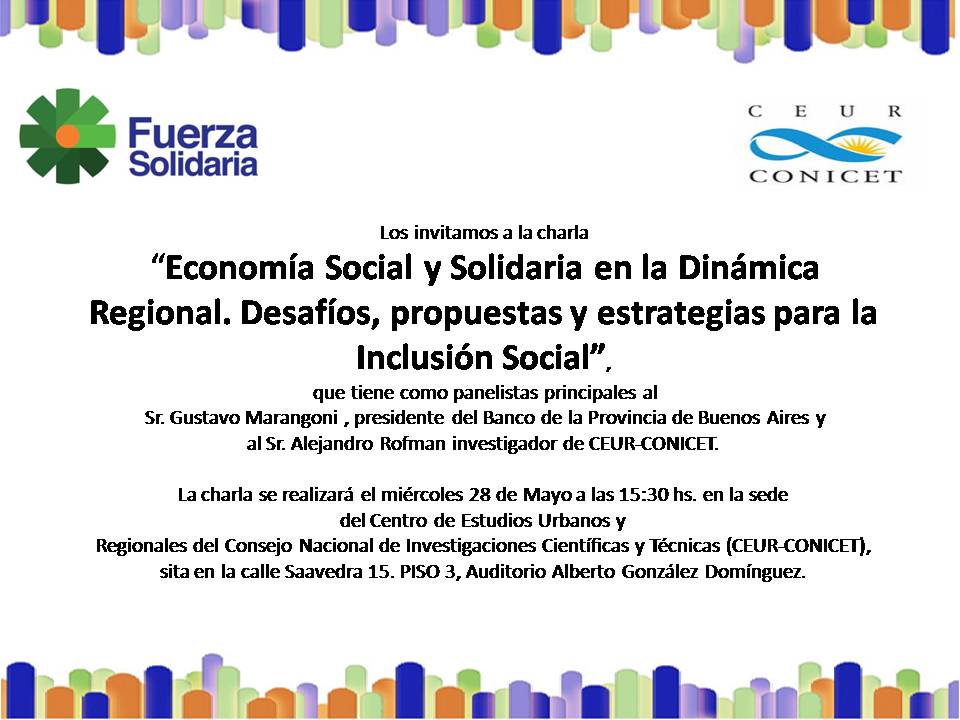 El próximo miércoles 28 de mayo, a las 15:30 hs se presentará la charla “Economía Social y Solidaria en la Dinámica Regional. Desafíos, propuestas y estrategias para la Inclusión Social”. La misma se llevará a cabo en la sede del Centro de Estudios Urbanos y Regionales del Consejo Nacional de Investigaciones Científicas y Técnicas (CEUR-CONICET), sita en la calle Saavedra 15. PISO 3, Auditorio Alberto González Domínguez.