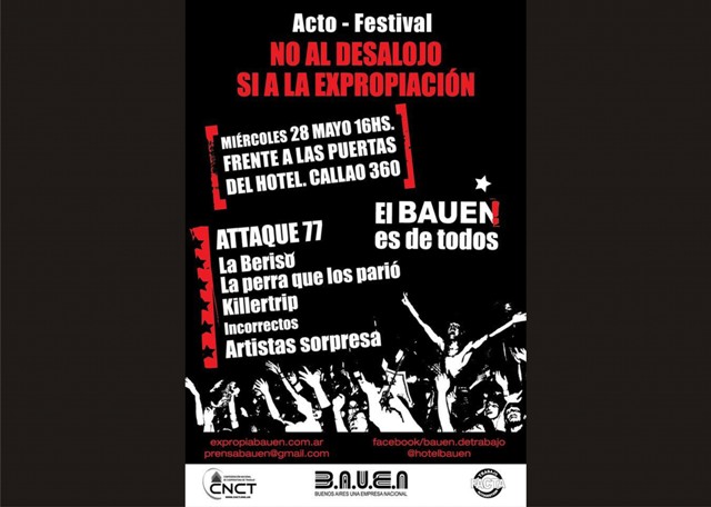 Con la consigna “No al desalojo. Sí a la expropiación”, y con la participación de las bandas de rock Attaque 77, La Beriso, La perra que los parió y otros artistas invitados, los trabajadores de la cooperativa B.A.U.E.N. llevarán a cabo este miércoles 28 de mayo a partir de las 16 un Acto-Festival frente a las puertas del hotel ubicado en Callao 360.